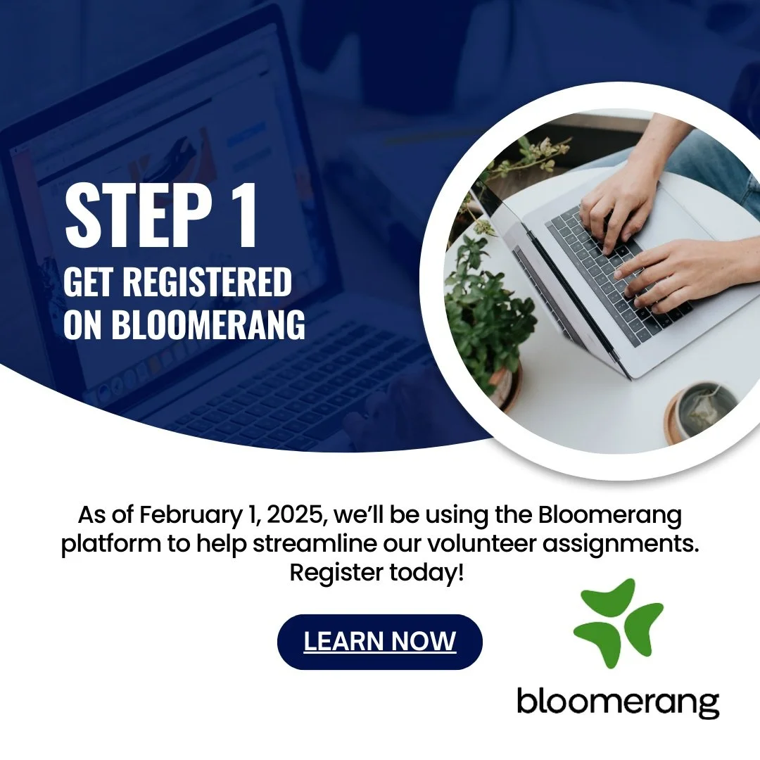 All on-site volunteers MUST register and schedule shifts through our volunteer app, Bloomerang.